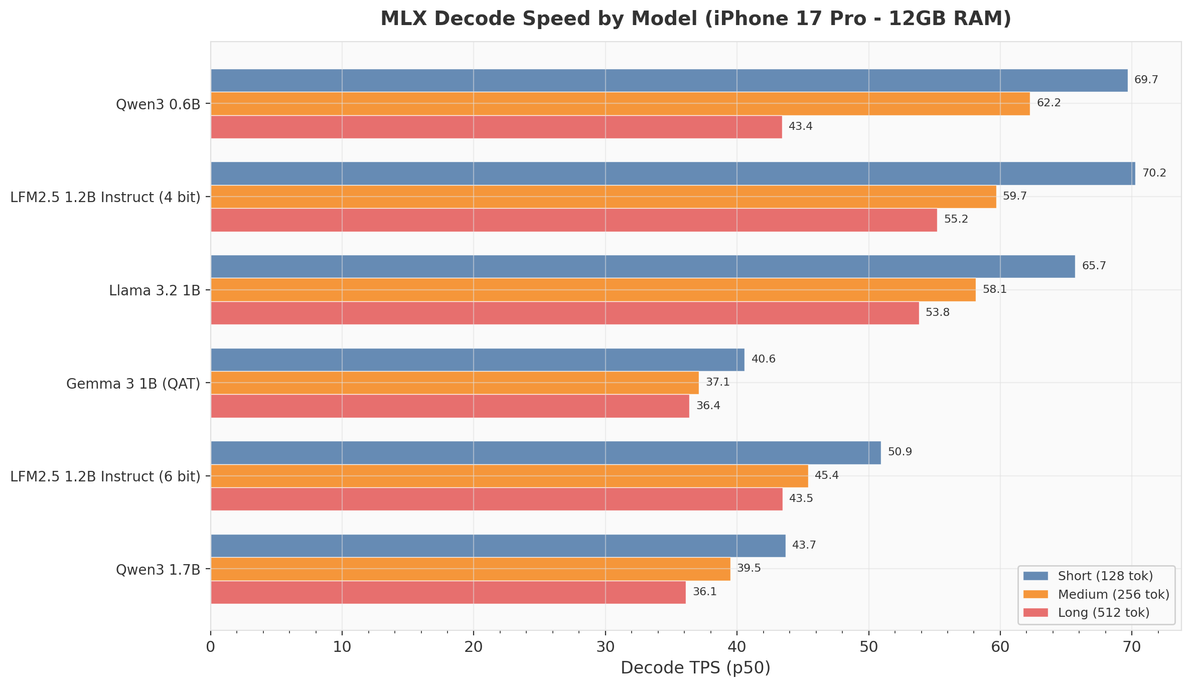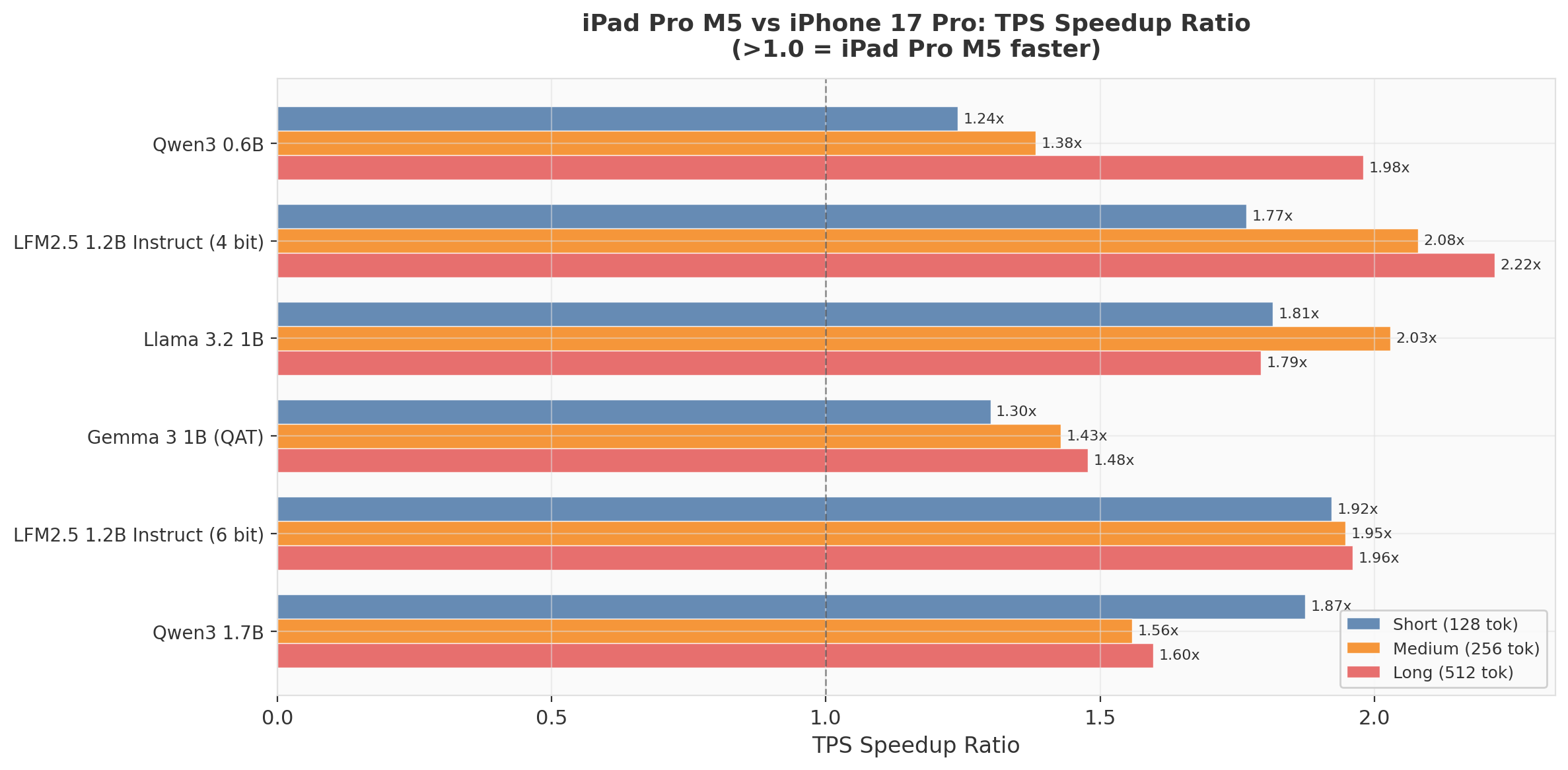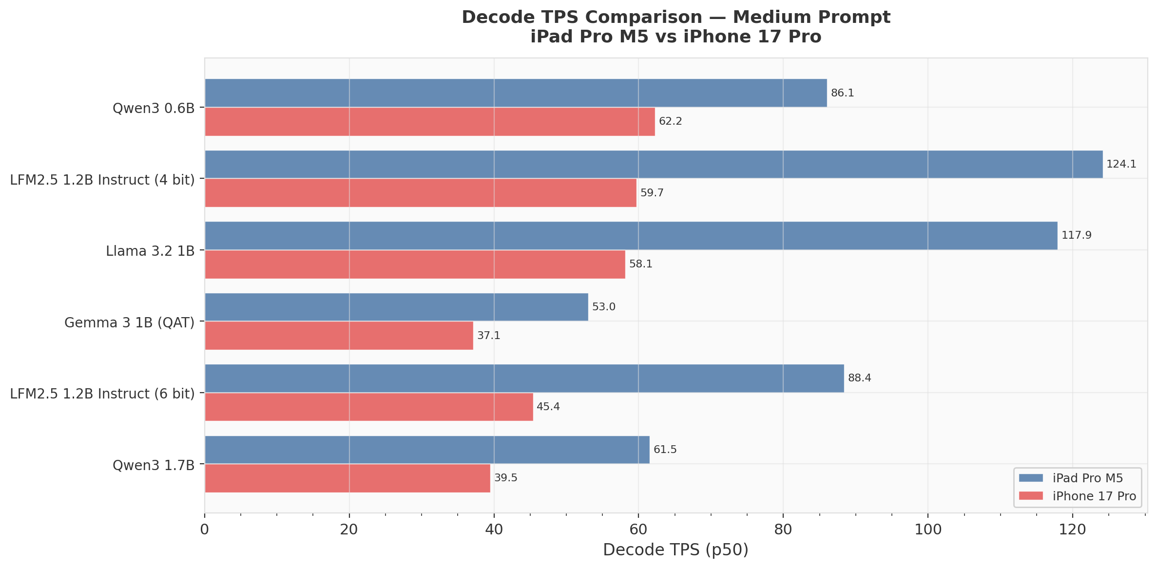 TL;DR: I ran 6 quantized LLMs on Russet which uses Apple's MLX framework on an iPhone 17 Pro and iPad Pro M5, both with 12GB RAM. LFM2.5 1.2B at 4-bit hits \(\text{124 tokens/sec}\) on iPad and \(\text{70 tokens/sec}\) on iPhone. iPad Pro is 1.2x–2.2x faster depending on model and prompt length, with the gap widening dramatically for longer contexts.
