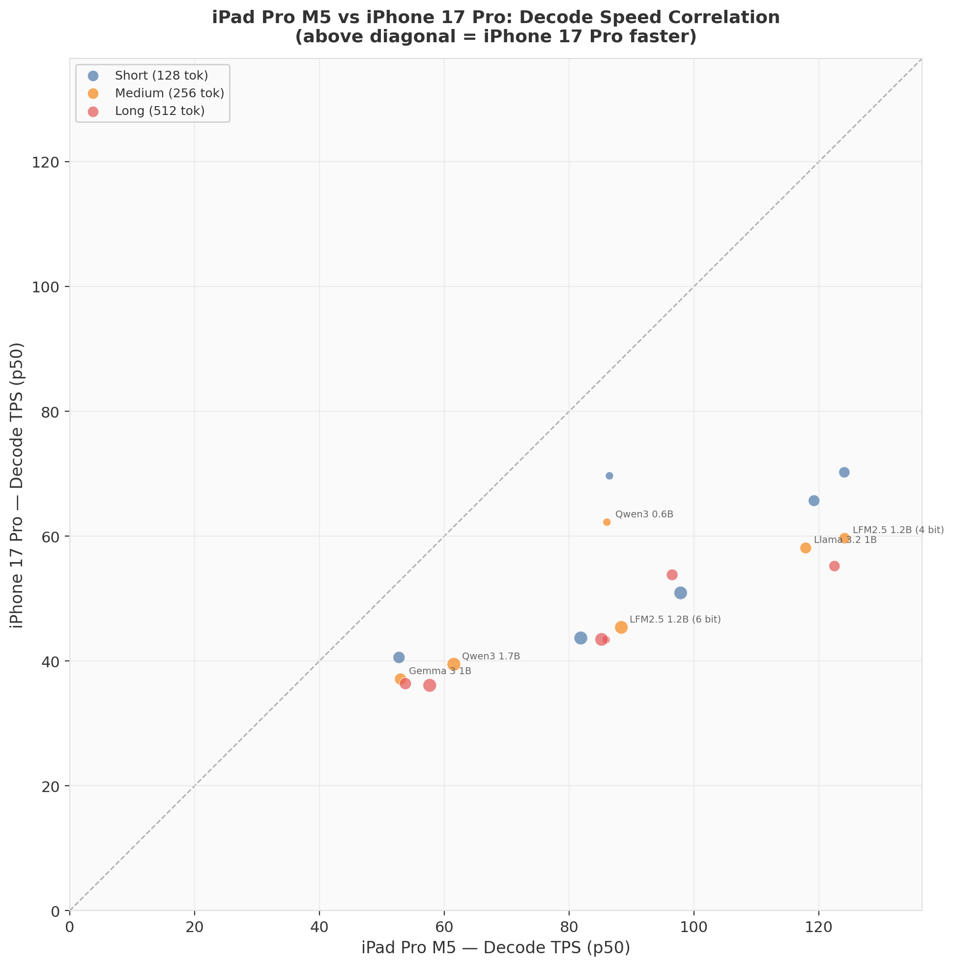 Every point sits below the diagonal (iPad faster). The spread increases from left to right — faster models on iPad see a proportionally larger gap over iPhone. Gemma 3 1B clusters in the lower-left (slow on both devices), while LFM2.5 4-bit occupies the extreme right (fast on iPad, moderate on iPhone). (Spent some extra time making this plot so kept it in.)