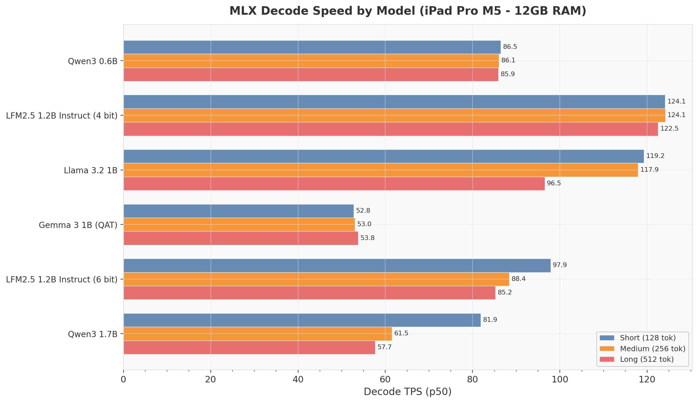 iPad tells a different story. LFM2.5 4-bit shows virtually no degradation: 124.1 / 124.1 / 122.5 TPS across short/medium/long. The M5's memory bandwidth is sufficient that KV cache pressure barely registers for this model. In contrast, Llama 3.2 1B drops from 119 to 97 TPS (−19%), and Qwen3 1.7B drops from 82 to 58 TPS (−29%).