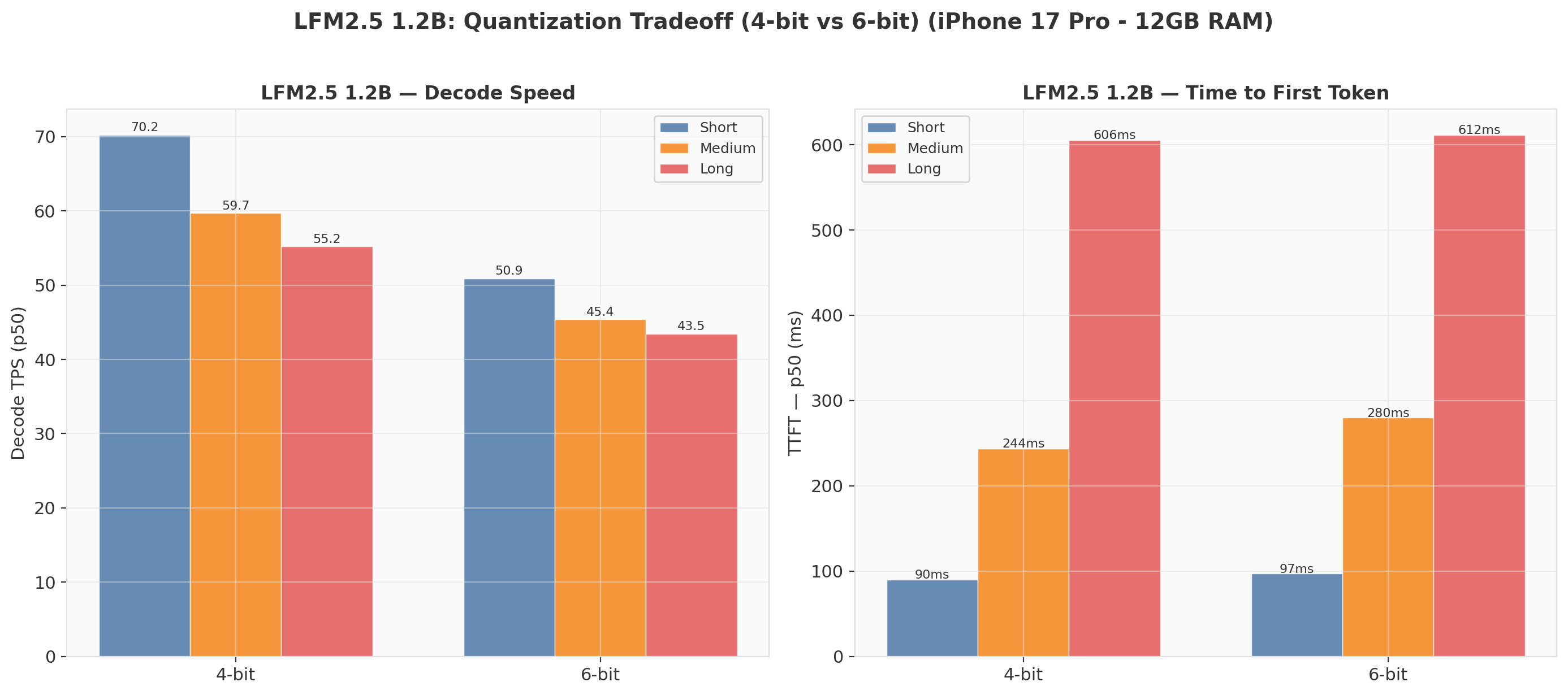 4-bit quantization is the sweet spot for mobile. The 6-bit variant of LFM2.5 is 21–27% slower with negligible TTFT difference. Unless you've measured a quality gap, go 4-bit.