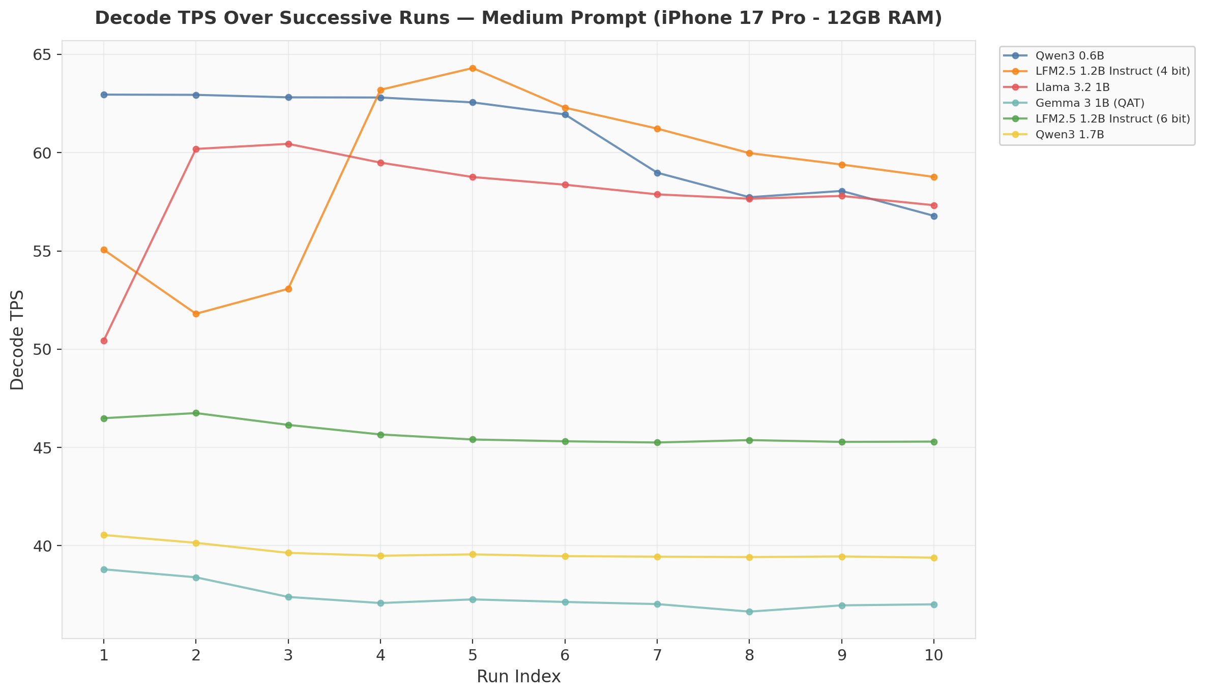 LFM2.5 4-bit does the opposite: starts at 55 TPS, ramps UP to 63 TPS by run 4-5, then slowly declines. This “warm-up” pattern suggests the MLX runtime or GPU scheduler optimizes kernel execution over the first few iterations.