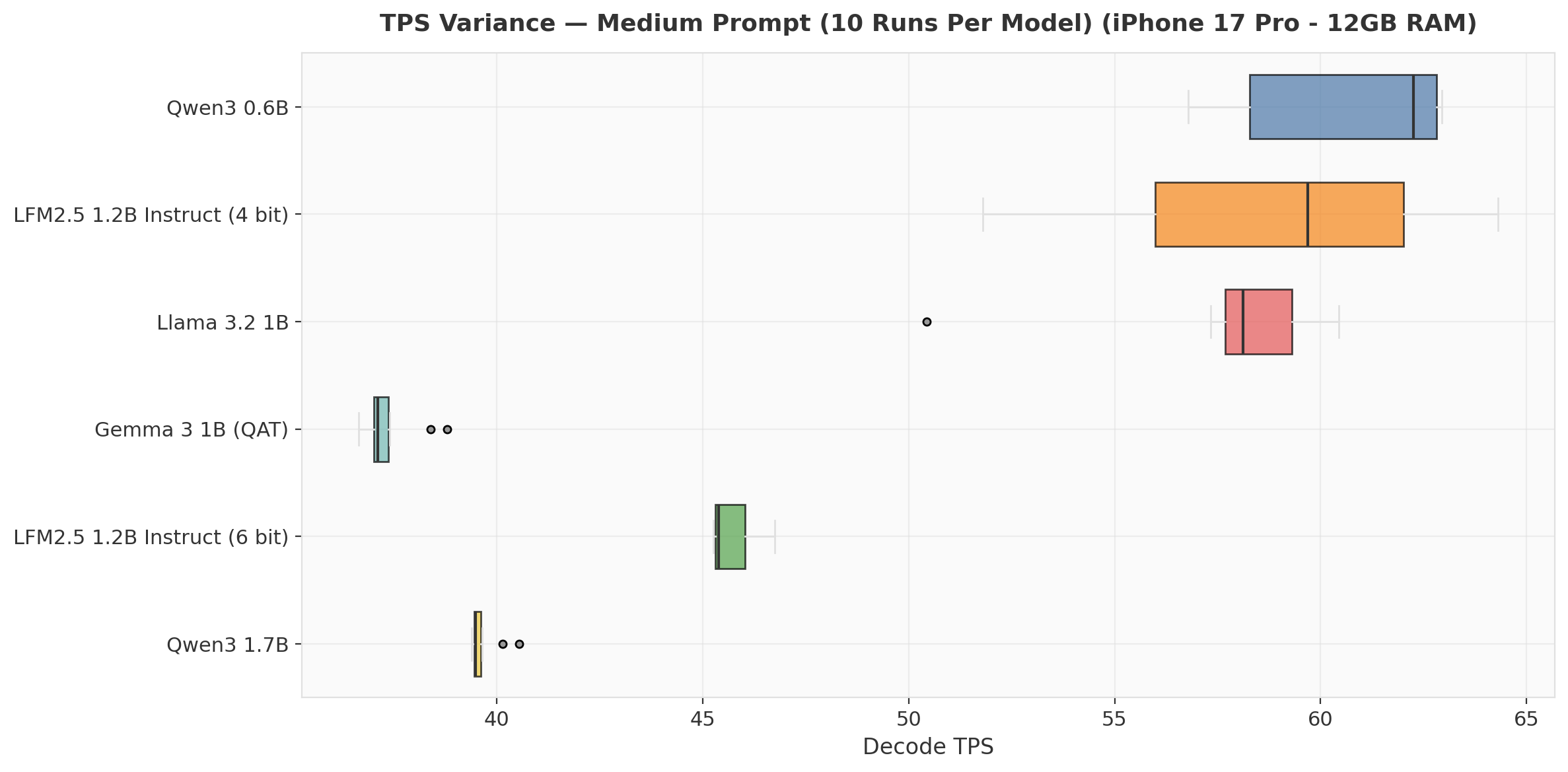 LFM2.5 4-bit has the widest interquartile range (consistent with the ramp-up pattern in the runs chart). Gemma 3 1B and Qwen3 1.7B are the most consistent — tight boxes with minimal spread, likely because they run well below the thermal ceiling.
