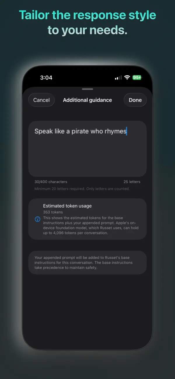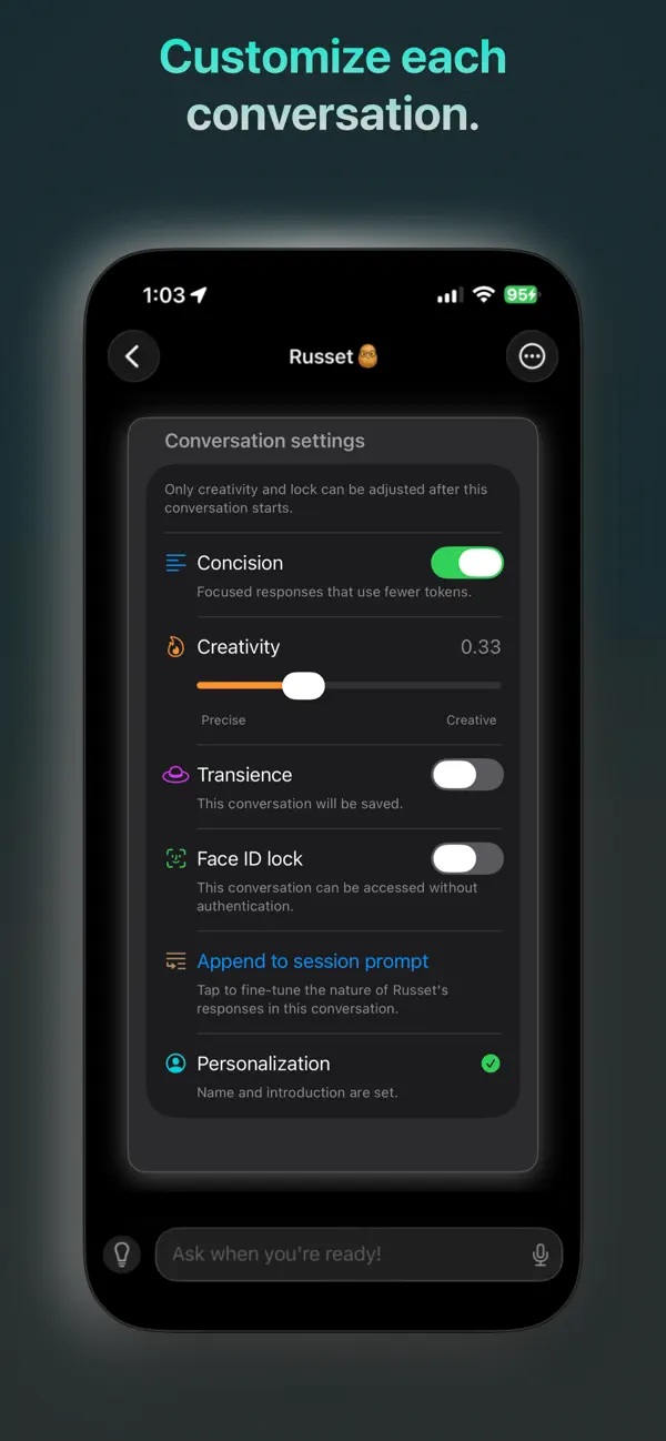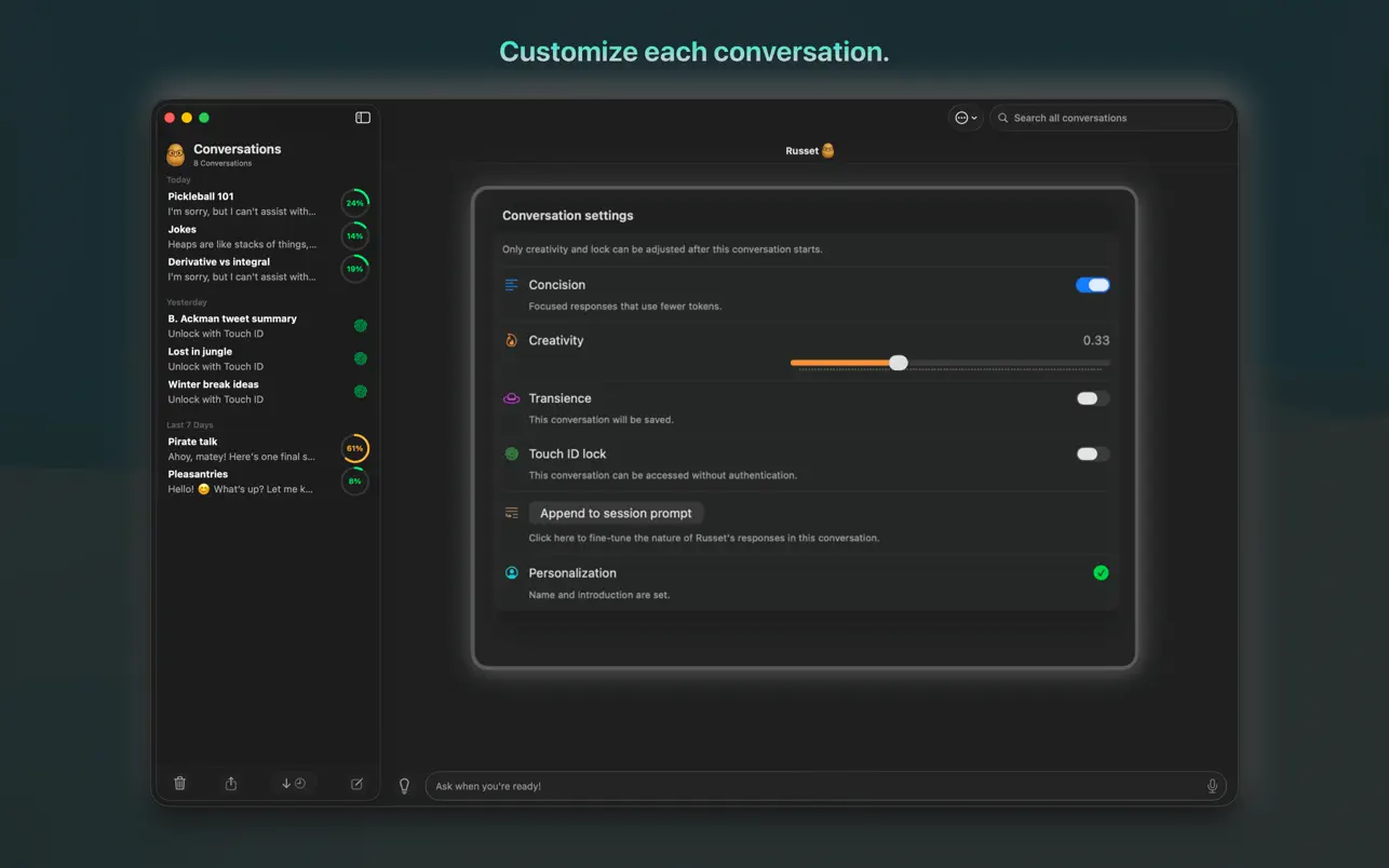 Customize how Russet responds: adjust creativity and tailor the conversation style to your needs. Got a private conversation you don't want anyone using your device to see? You can just lock it with your on-device biometrics. Whether you're offline, off-grid, or just want complete privacy, Russet works anywhere without compromise.